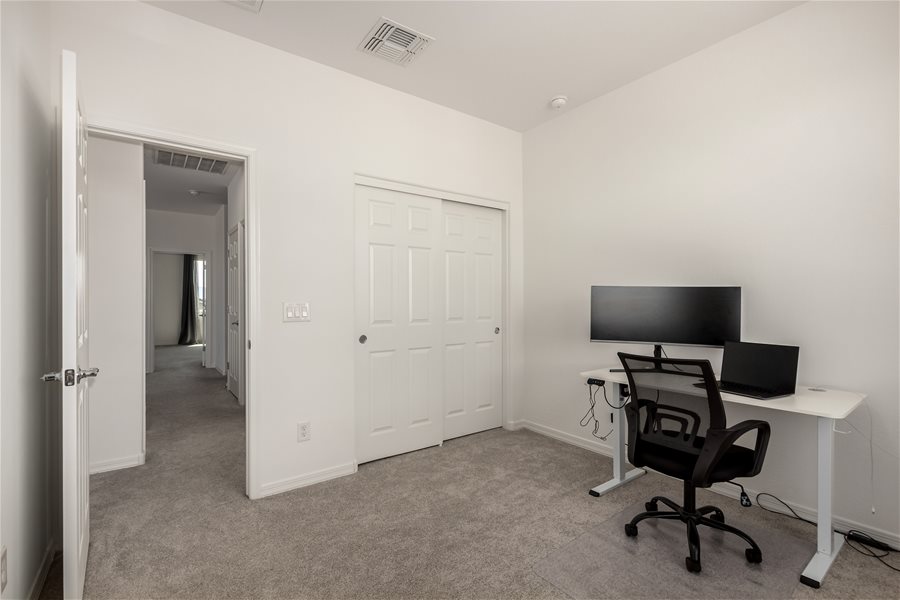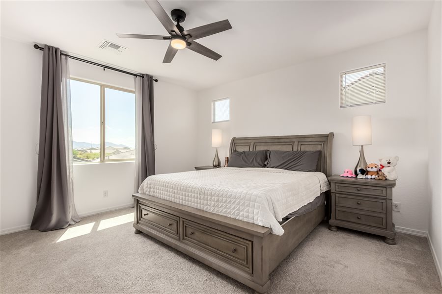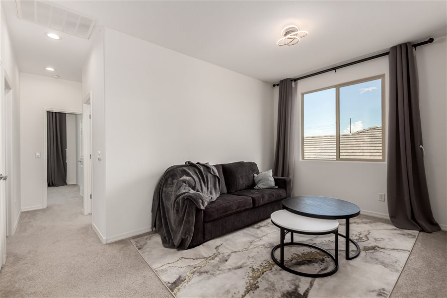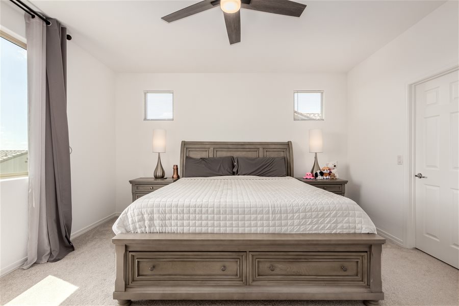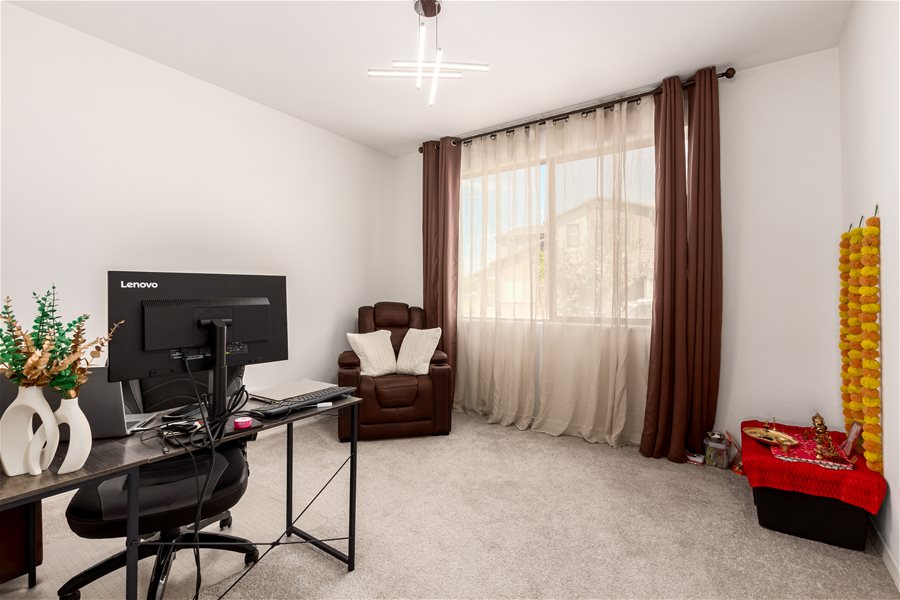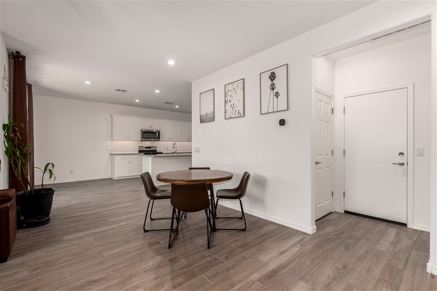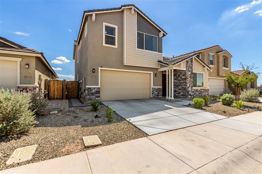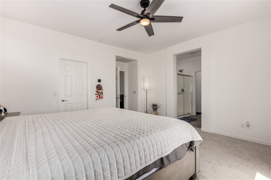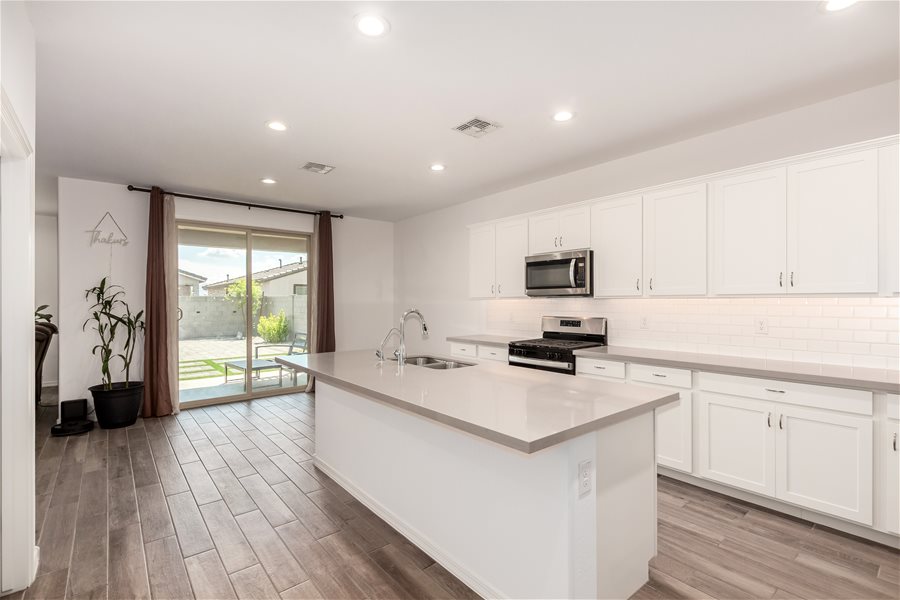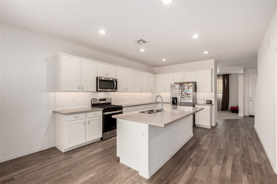 Move-in ready home w/all appliances, solar, water softener, & R.O.! The first floor offers a private guest suite with its own bathroom and walk-in closet, plus a versatile flex room ideal for a home office, game room, or sitting area. Beautiful wood-look tile plank flooring extends throughout the main level. Upstairs, you’ll find a spacious loft, the owner’s suite, and two additional bedrooms. The modern kitchen features stainless steel appliances, a gas range, and a large island with Great Room & Loft! Elegant creamy white cabinetry pairs beautifully with upgraded quartz countertops and matching wood-look tile floors. **Community Pool with biking, walking path, playground, & more. Synthetic Grass in backyard!